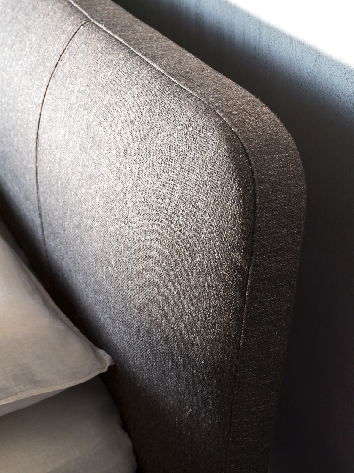 La capçalera alta i entapissada aporta presència i confort. El cos rodó està marcat per franges amb costures visibles, que permeten combinacions refinades entre teixits i pell.