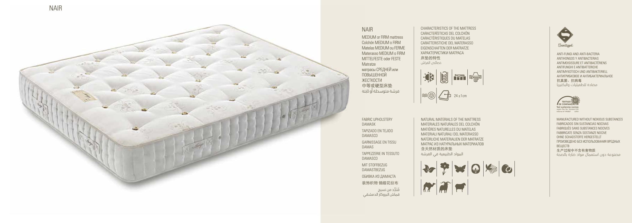 Aquest matalàs Nair és fruit d’un exquisit treball artesà que utilitza materials nobles com la viscosa, la seda, el lli, el cotó, el Làtex 100% natural, la llana bio soft i la llana de camell.