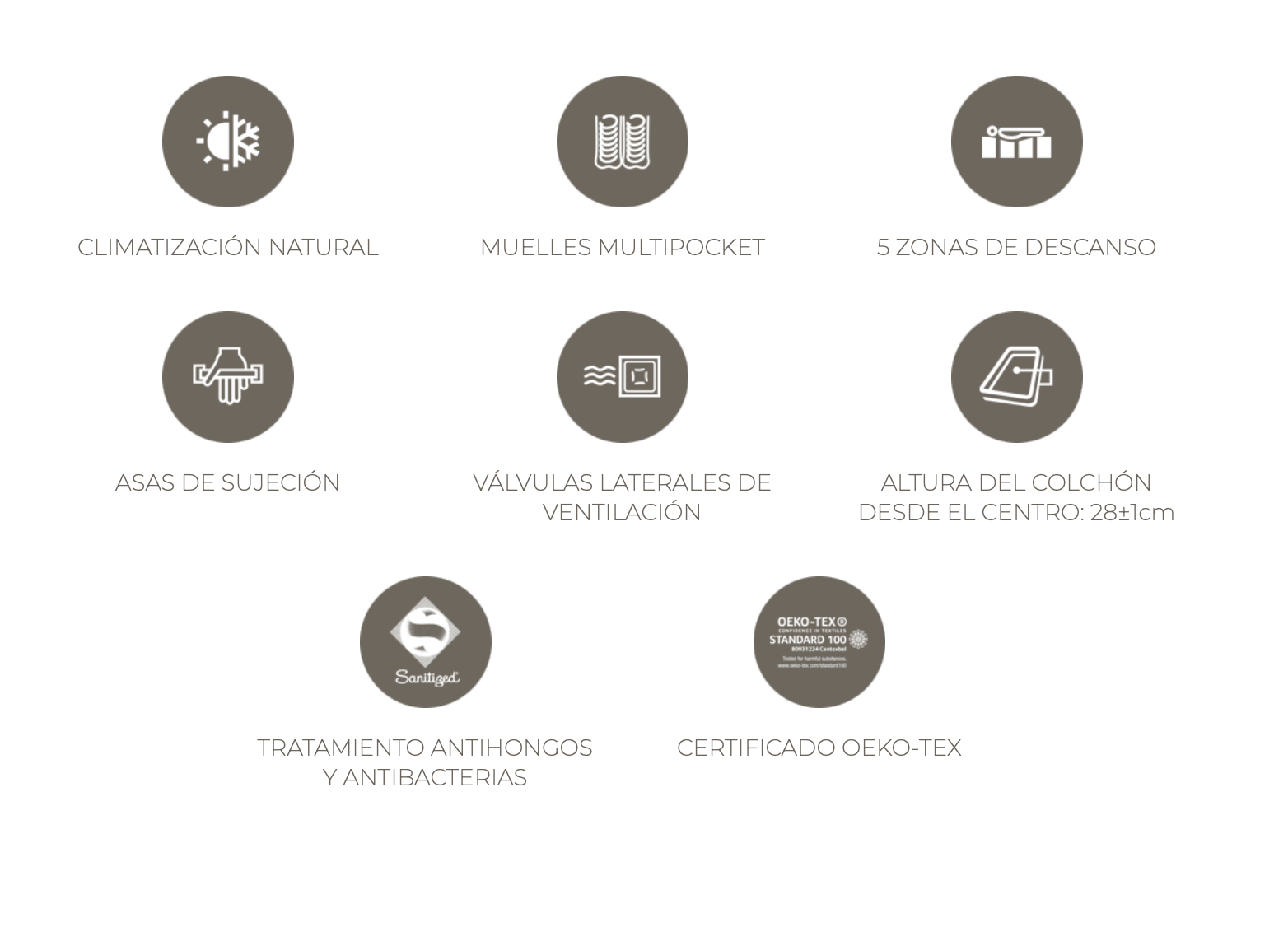 És confeccionat manualment per artesans i compta amb certificació Öko‑Tex 100. També incorpora tractaments Sanitized® antiàcars i antimicrobians, així com vàlvules laterals de ventilació i nanses per facilitar la rotació i el manteniment.