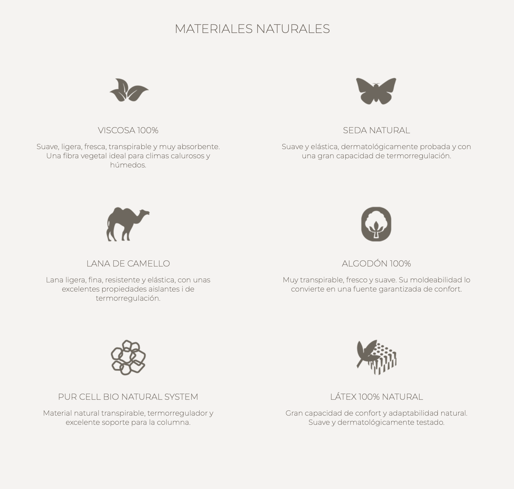 En aïllaments naturals, incorpora viscosa 100%, seda natural, llana de camell (cara d’hivern), i algunes variants amb cotó 100% per a l’estiu. A més, inclou materials com Pur Cell Bio Natural System, látex natural 100% i fibra de coco, que aporten transpirabilitat, suport i elasticitat en cada canvi de postura durant la nit.