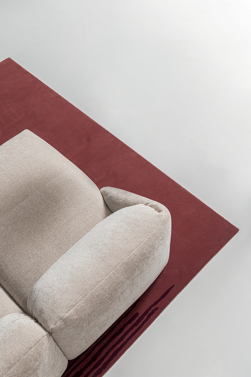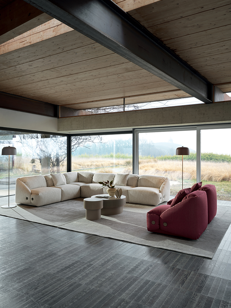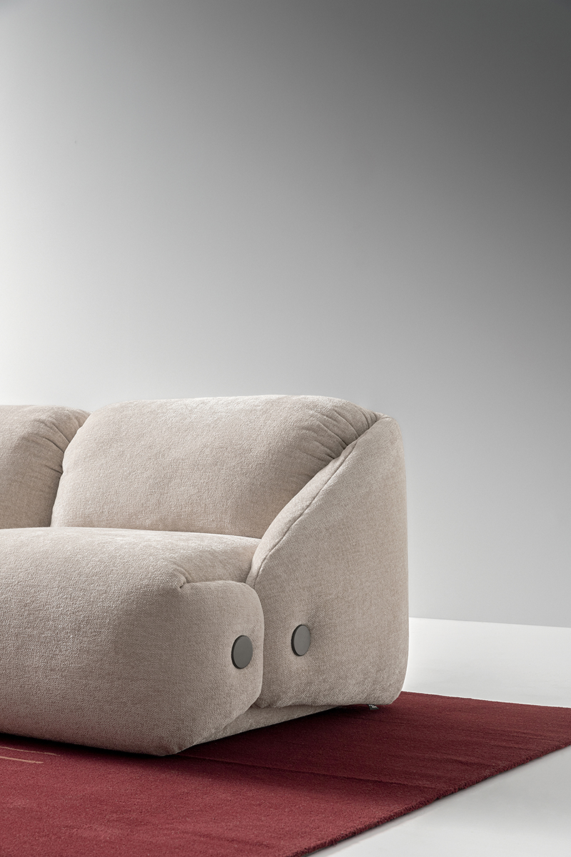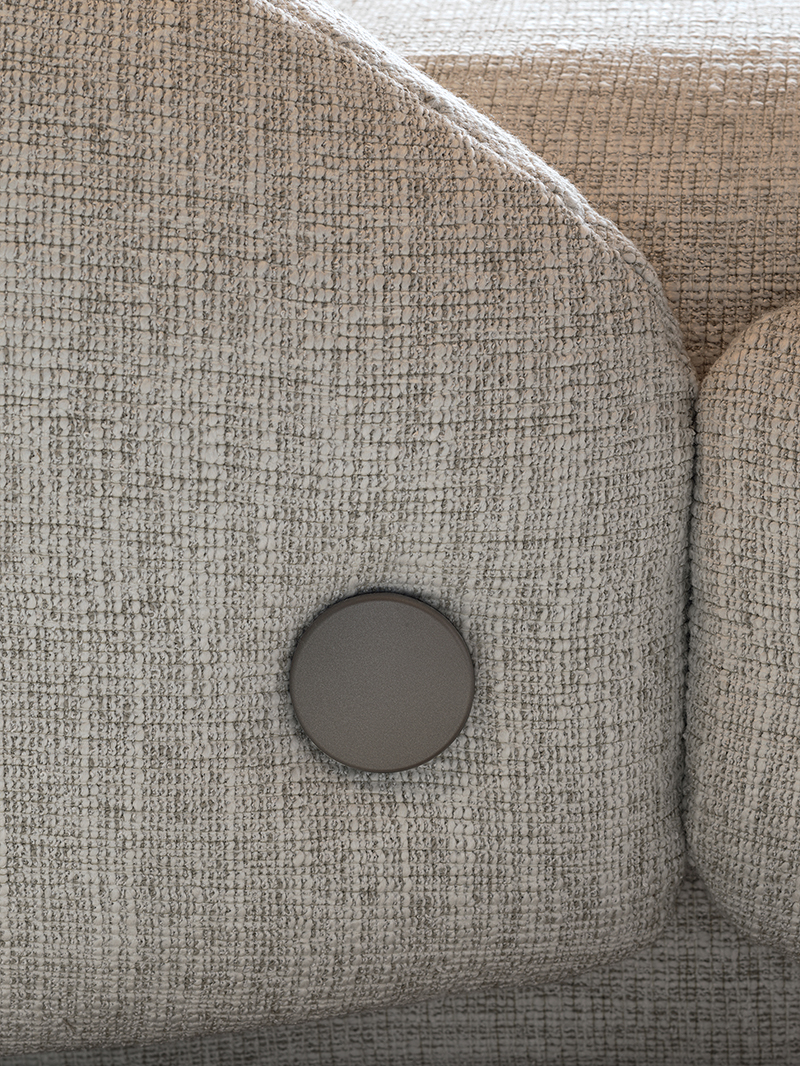 El disseny evoca la precisió d’una peça de sastreria. Les vores del respatller i el seient s’inspiren en els detalls d’un coll abotonat. El resultat és un sofà visualment ric i còmode, amb seients generosos i una presència sofisticada.