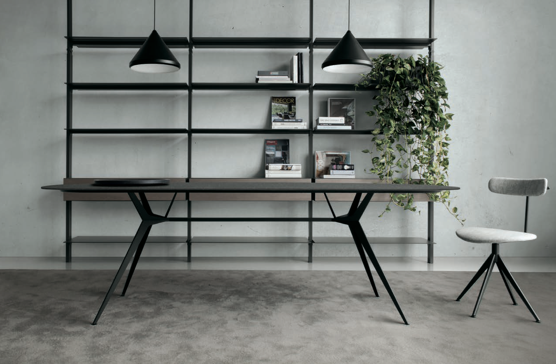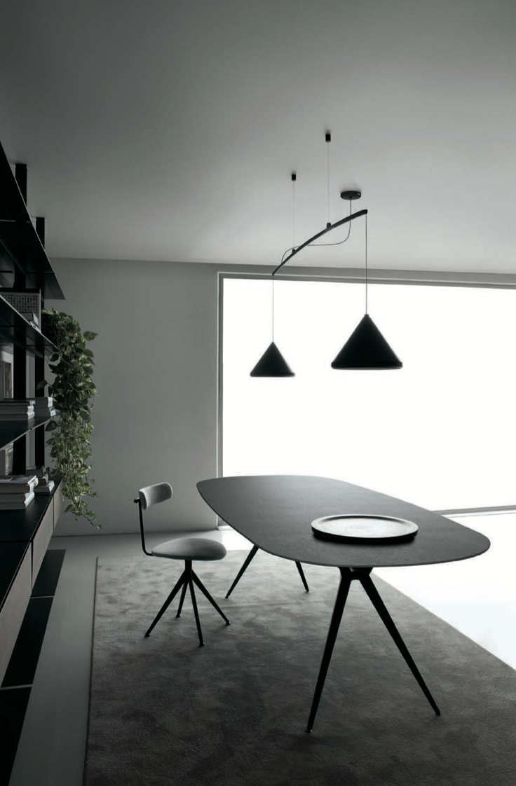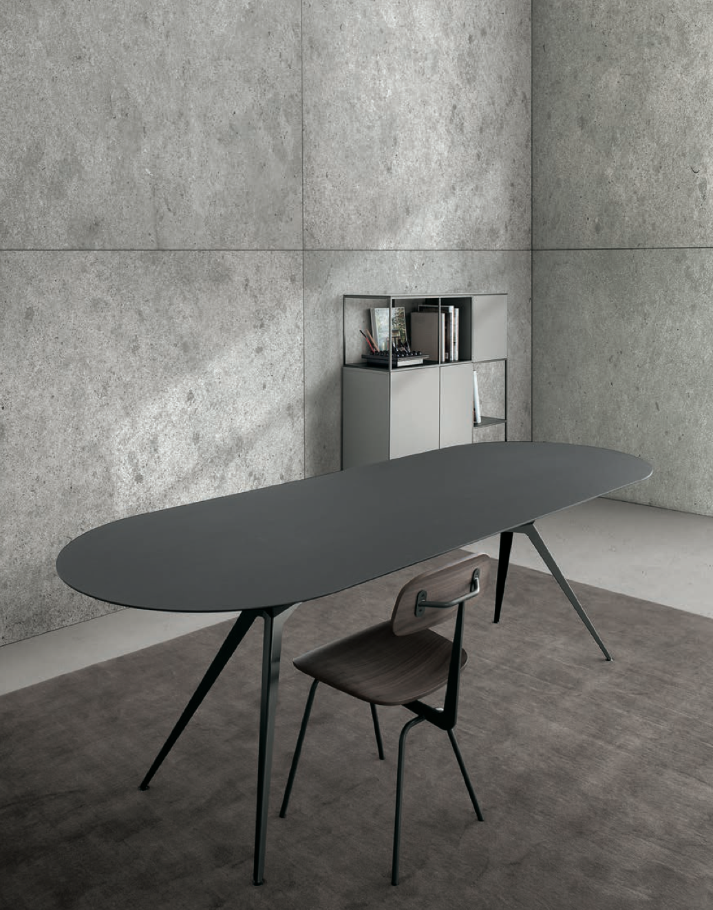 Aquesta estructura s’adapta fàcilment a diferents configuracions, cosa que fa que sigui una peça molt versàtil. El sobre de la taula es pot escollir en diversos acabats: HPL de només 6 mm de gruix, ceràmica o pedres naturals. Gràcies a aquest gruix reduït, la taula guanya resistència estructural i aconsegueix una silueta fina i elegant.